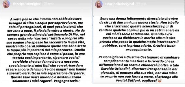 Tina Cipollari non ci sta e si scaglia contro il gossip sulla sua vita privata. La bionda opinionista critica fortemente il modo con cui è stata diffusa un’indiscrezione che avrebbe destabilizzato i suoi figli. “Quello che proprio non capisco è come si possa, in una testata così importante, riportare voci di corridoio che non fanno bene a nessuno, specialmente ai miei figli, che vorrei ricordare essere ancora dei minori, e che magari non hanno superato del tutto la mia separazione dal padre. Queste fake news illudono e destabilizzano solamente i miei ragazzi. Vergognatevi!”, ha scritto Tina nel suo durissimo messaggio. Tina, poi, ha spiegato di essere una “donna felicemente divorziata che da due anni vive una nuova storia. Non è bello che si scrivano queste sciocchezze pur di vendere qualche copia in più di un settimanale da cui mi dissocio totalmente. Quando avrà qualcosa da dichiarare in merito alla mia vita privata che possa in qualche modo interessare il pubblico sarò io la prima a farlo. Grazie e buon proseguimento”. Tina, infine, conclude il suo sfogo con un “buffoni, pagliacci”.