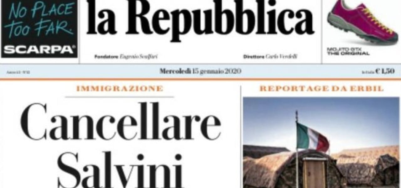 Prima pagina di Repubblica: “Cancellare Salvini”.