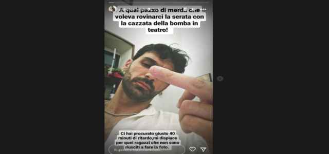 “A quel pezzo di mer*a che voleva rovinarsi la serata con la caz*ata della bomba in teatro”, scrive Todaro mostrando il dito medio. “Ci hai procurato giusto 40 minuti di ritardo. Mi dispiace per quei ragazzi che non sono riusciti a fare le foto“, ha aggiunto il maestro di Amici.