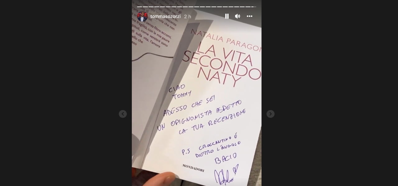 “La vita secondo Naty” è il libro che Natalia Paragoni ha pubblicato nei mesi scorsi. Ma torna d’attualità per una dedica speciale che ha lasciato a Tommaso Zorzi. Il vincitore della scorsa edizione del Grande Fratello Vip ha, infatti, pubblicato una storia su Instagram in cui mostra il libro e appunto la dedica dell’amica, fidanzata con il suo ex coinquilino della Casa Andrea Zelletta. “Raga, sono un po’ in ritardo ma mi è arrivato ora il libri di Naty con una dedica”, dice Tommaso Zorzi. Poi legge la dedica: “Ciao Tommy adesso che sei un opignonista aspetto la tua recenzione. P.S Croccantino è dietro l’angolo Baci”.