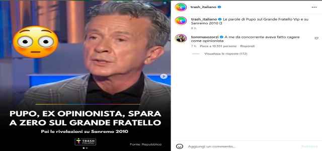 Le parole di Pupo sono state riportate da Instagram dalla pagina Instagram “Trash Italiano”. Il post è stato commentato da tantissimi utenti, compreso da Tommaso Zorzi che è stato un concorrente di una delle edizioni del Grande Fratello Vip che ha avuto come opinionista proprio Pupo.