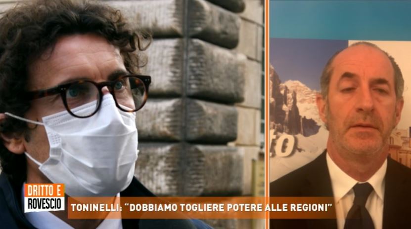 Danilo Toninelli, come anticipato sopra, si è poi schierato dalla parte del governatore del Veneto, Luca Zaia: “Posso dire che rispetto a Fontana, Zaia, mamma mia, rispetto a Gallera, Zaia, tutta la vita e ho sempre detto senza paura, a differenza di quanto fanno i leghisti, che se uno lavora meglio dell’altro io lo dico. Non ho paura a dire che Zaia abbia lavorato molto meglio di Fontana e dei lombardi – ha aggiunto a Dritto e Rovescio – e che la medicina territoriale, i medici di famiglia, in Veneto, ce ne sono di più rispetto a quelli che ci sono in Lombardia, e che se in Veneto durante la prima ondata ci sono stati meno morti è perchè la gente contagiata veniva curata a casa prima di andare all’ospedale”. Quindi la proposta a Zaia: “A Zaia dico lasci la Lega, fondi il suo partito visto che ha così tanto consenso, perchè lui ha dimostrato di essere diverso dal partito di cui fa parte”.