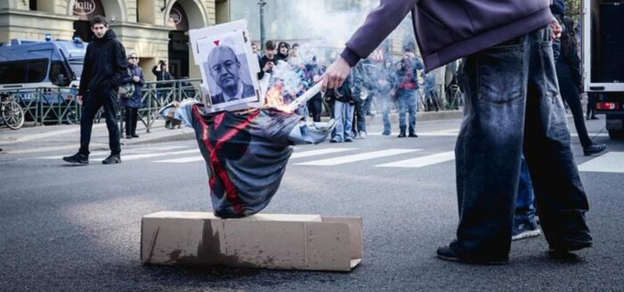 La mattinata dei manifestanti – d’altra parte – era iniziata tranquillamente, ma una volta giunti in Piazza Castello si sono trovati il classico sbarramento della polizia di Torino: tra insulti, spintoni e urla, la tensione è salita alle stelle e sono iniziati a volare i manganelli, le uova e – appunto – l’ordigno rudimentale; mentre lasciata la piazza i manifestanti lungo il loro percorso che li ha condotti fino alla Mole Antonelliana e a Palazzo Nuovo hanno danneggiato un cellulare della polizia, imbrattato alcuni monumenti e – quasi culmine della protesta studentesca – dato alle fiamme un fantoccio che raffigurava il ministro Valditara; coinvolgendo (con alcune foto imbrattate con del sangue finto) anche gli altri esponenti del governo e dell’opposizione.
