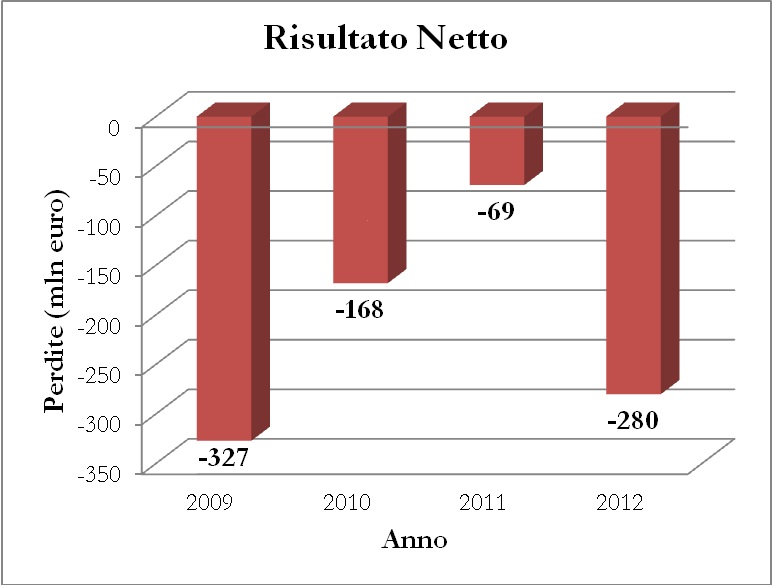 Il volo alla guida di Alitalia di Andrea Ragnetti, come amministratore delegato della compagnia, non è stato lungo. Infatti, ieri il presidente Roberto Colaninno ha preso la cloche anche se temporaneamente dopo un anno dal precedente addio di Rocco Sabelli. La compagnia ha chiuso con una perdita netta di 280 milioni di euro nel 2012, accumulando così delle perdite, dalla rinascita della Fenice in poi, di 844 milioni di euro (a fondo pagina il grafico riassuntivo). L’andamento è preoccupante, perché dopo un parziale recupero nel primo triennio di gestione dell’ex amministratore delegato Rocco Sabelli, le perdite sono esplose nel corso dell’ultimo anno. Come ricordavo già su queste pagine, il fatto di avere avuto un trimestre positivo estivo conta ben poco nel settore aereo.