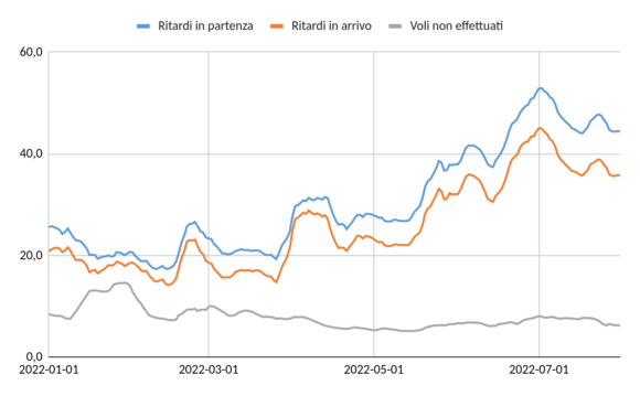 A loro volta le compagnie non si aspettavano una ripresa così rapida del trasporto aereo e sembrano aver messo in vendita più voli di quelli che erano in grado di effettuare con gli equipaggi a disposizione, pensando probabilmente di accorparli al momento della partenza, trasportandovi comunque tutti i passeggeri prenotati. Il più rapido ritorno della domanda non lo ha tuttavia reso possibile e si è purtroppo tradotto in una buona quantità di voli non effettuati che hanno lasciato i passeggeri a terra e in un gran numero di voli in ritardo. Il caos sembra dunque essere grande sotto il cielo, ma a differenza di quello che potrebbe pensarne Confucio, condiviso da Mao, la situazione non sembra così eccellente. Abbiamo allora pensato per i lettori del Sussidiario di elaborare un po’ di numeri sui ritardi aerei, da pochissimo disponibili con regolarità quotidiana da parte di Eurocontrol, l’ente europeo di coordinamento del traffico aereo. Quali sono i Paesi coi ritardi maggiori? E gli aeroporti? Qualcuno di essi si salva? E soprattutto, la tendenza generale a livello europeo è verso un miglioramento o un peggioramento dei problemi che si sono manifestati tra giugno e luglio?