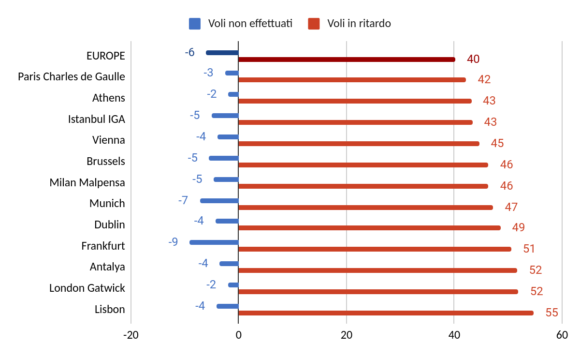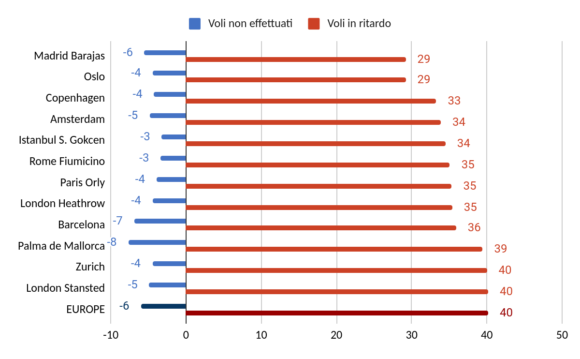 Grafico 1 – Voli non effettuati e voli in ritardo in Europa (dati %)