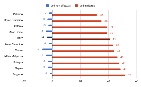 Nel complesso possiamo dire che la situazione italiana non sia la migliore a livello europeo, ma comunque tra le migliori e distante dalle peggiori. Questo ci permette di dichiararci parzialmente soddisfatti del modo in cui l’Italia sta affrontando questi disagi, anche considerando che, data l’interdipendenza dei sistemi nazionali, ogni Paese non può essere esente dai problemi che sorgono negli altri. Se la compagnia di un Paese non italiano sopprime un volo per l’Italia anche le nostre statistiche lo mostreranno e lo stesso accade quando un volo che decolla in ritardo verso di noi atterrerà in ritardo in un nostro aeroporto non essendo riuscito a recuperare durante la crociera.