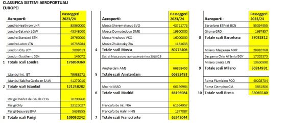 Il sistema aeroportuale milanese (Linate, Malpensa e Orio Al Serio), secondo la mia opinione, non funziona bene, perché non esprime il vero potenziale della capitale economica d’Italia e della zona metropolitana più grande e popolata del Paese. Potrebbe essere sede del quarto hub intercontinentale europeo, raccogliendo almeno il traffico di Malpensa e Linate in un luogo a pochi chilometri dal centro città. Attualmente, i tre aeroporti di Milano riescono ad arrivare al nono posto in Europa per numero di passeggeri, superando comunque i due aeroporti di Roma (Fiumicino e Ciampino), come si può evincere nelle tabelle che seguono: