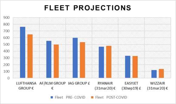 Nel grafico che segue sono riportate le dimensioni della flotta aerea dei principali player europei prima e dopo la pandemia.