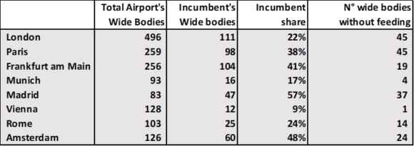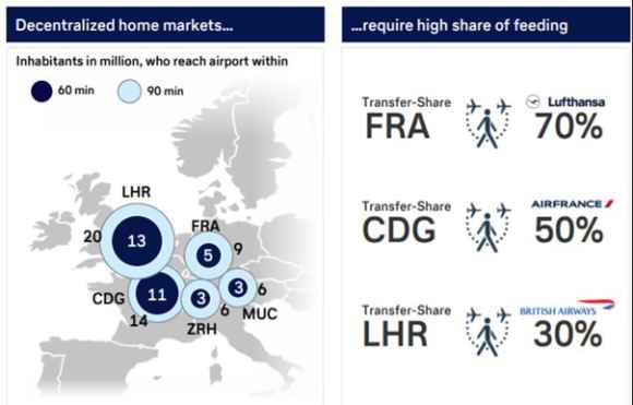 La tabella che segue evidenzia, ad esempio, che Lufthansa, come essa stessa dichiara nei prospetti del bilancio, è costretta ad alimentare da altri territori una larghissima parte dei propri voli di lungo raggio, a cui il modello Hub&Spoke deve fornire un contributo pari addirittura al 70% dei passeggeri! In altri termini, solo il 30% dei passeggeri Lufthansa di lungo raggio che partono da Francoforte origina dalla specifica Catchment Area della città.