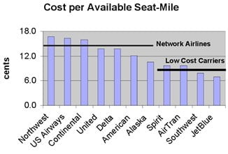 Il processo di consolidamento avvenuto negli Stati Uniti, il più delle volte nell’ambito delle procedure giudiziarie (Chapter 11) degli anni 2000-2010, ha visto i grandi player americani aumentare significativamente i livelli di efficienza e produttività sino a raggiungere, nell’attualità, valori dei costi unitari, considerando il diverso ventaglio di servizi offerti, non troppo distanti da quelli dei vettori Usa low cost come Southwest, AirTran o JetBlue, come si evince dal grafico sottostante.