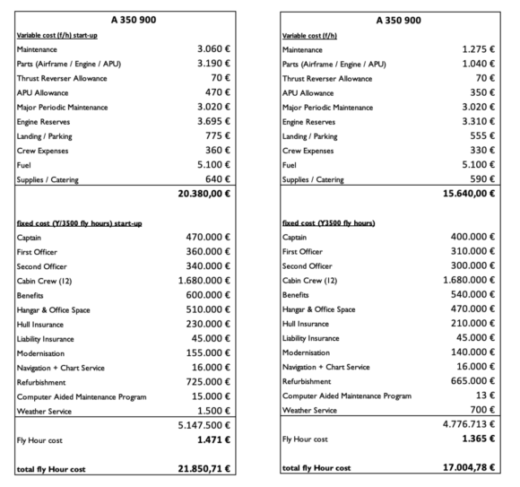Una volta che l’aereo sarà entrato in flotta l’aeromobile dovrà operare le rotte per le quali è stato acquistato e questo prevede che il settore competente effettui dei calcoli per stabilire il costo per ogni ora di volato nonché quanto dovrà rendere la vendita dei sedili. In ambito aeronautico il costo ora volo viene calcolato inserendo alcuni parametri come ad esempio i costi di manutenzione, quelli del carburante, degli equipaggi e così via. Noi abbiamo calcolato che un ora di volo di un Airbus A350-900 ha un costo stimato tra i 17 mila euro e i 22 mila euro a seconda che la compagnia aerea viva una fase di start-up o sia già una compagnia aerea affermata da alcuni anni.
