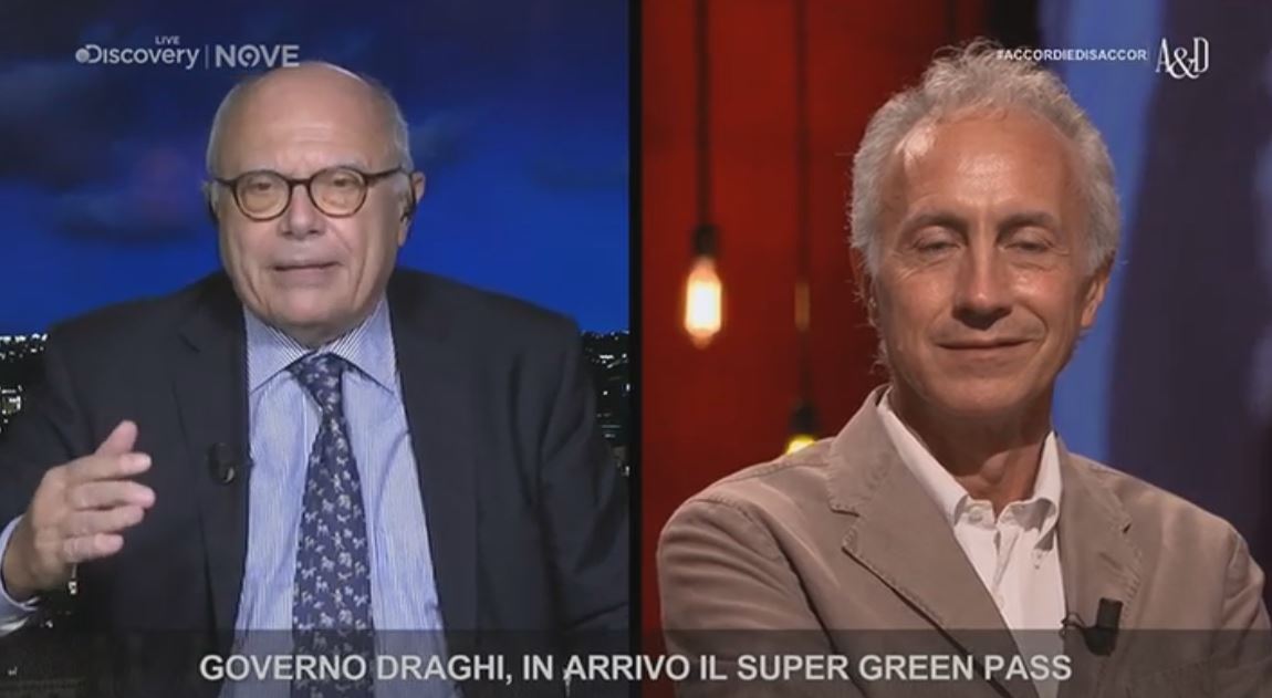 Battibecco andato in onda ieri sera in tv durante la prima puntata della nuova stagione di Accordi e Disaccordi, sul 9. Ospite Marco Travaglio in studio e in collegamento il professor Massimo Galli, primario di malattie infettive dell’ospedale Sacco di Milano. Il direttore de Il Fatto Quotidiano esordisce spiegando che ci sono molti medici non vaccinati che continuano a lavorare perchè se no resterebbero sguarnite le corsie: “Voglio vedere praticamente cosa succede se alcune milioni di persone restano a casa (riferendosi all’estensione dell’obbligo del green pass ndr) Negli ospedali c’è l’obbligo e credo che sia giusto ma abbiamo scoperto che il 60/62% del personale sanitario non vaccinato lavora ancora, sono tutti al loro posto. Semplicemente perchè le corsie si guarniscono”.