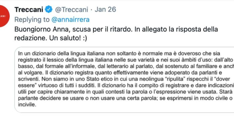 Il battibecco a colpi di tweet ha coinvolto una giornalista dell’agenzia di stampa britannica Reuters e l’enciclopedia più famosa d’Italia. “Si può cancellare quella scritta?” chiede la giornalista. Ma l’enciclopedia risponde di no. E lo motiva con argomentazione secca e schiacciante. “Il dizionario – scrive la redazione – ha il compito di registrare e dare indicazioni utili per capire chiaramente in quali contesti la parola o l’espressione viene usata. Starà al parlante decidere se usare o non usare una certa parola; se esprimersi in modo civile o incivile”. Stoccata finale, una citazione da 1984 di Orwell. “Non siamo in uno Stato etico in cui una neolingua “ripulita” rispecchi il “dover essere” virtuoso di tutti i sudditi”.