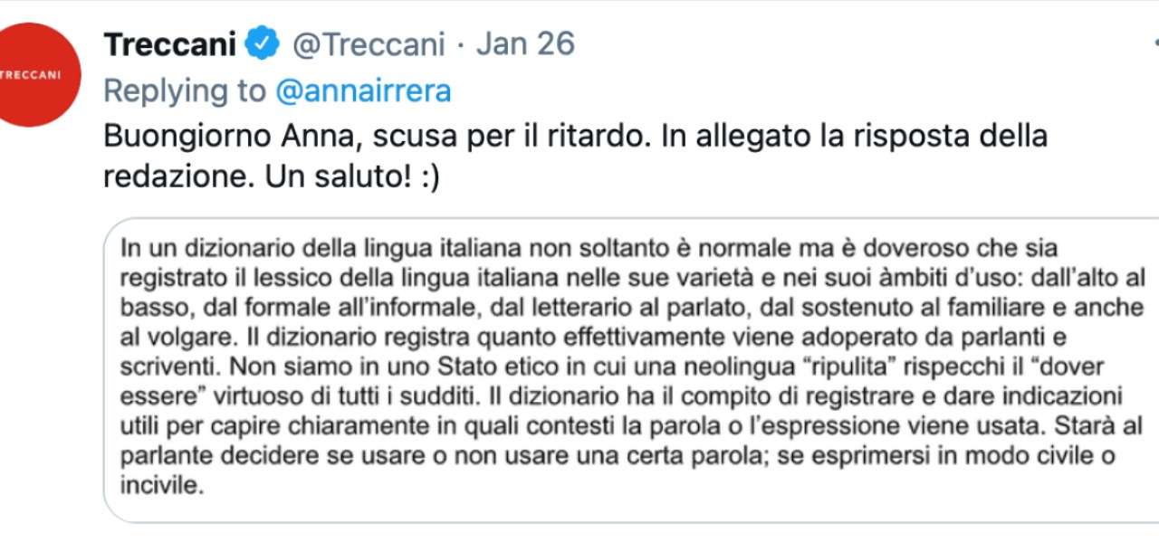 Il battibecco a colpi di tweet ha coinvolto una giornalista dell’agenzia di stampa britannica Reuters e l’enciclopedia più famosa d’Italia. “Si può cancellare quella scritta?” chiede la giornalista. Ma l’enciclopedia risponde di no. E lo motiva con argomentazione secca e schiacciante. “Il dizionario – scrive la redazione – ha il compito di registrare e dare indicazioni utili per capire chiaramente in quali contesti la parola o l’espressione viene usata. Starà al parlante decidere se usare o non usare una certa parola; se esprimersi in modo civile o incivile”. Stoccata finale, una citazione da 1984 di Orwell. “Non siamo in uno Stato etico in cui una neolingua “ripulita” rispecchi il “dover essere” virtuoso di tutti i sudditi”.