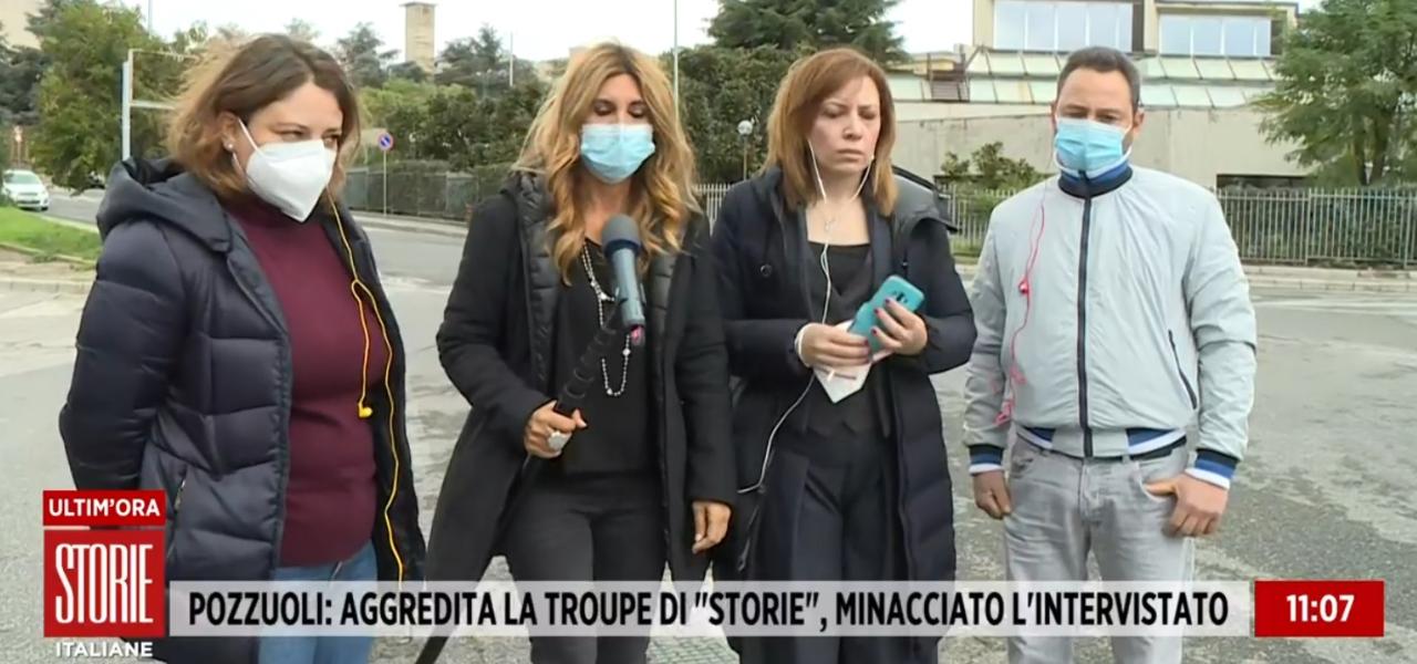 Storie Italiane, troupe aggredita in diretta tv a Pozzuoli: la giornalista Carla Lombardi e il cameraman accerchiati e in fuga