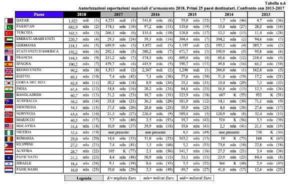 Per quanto attiene il rapporto tra il nostro paese e la Turchia nel settore dell’esportazione delle armi ci limitiamo a riportare la tabella della Relazione sulle “Operazioni autorizzate e svolte per il controllo dell’esportazione, importazione e transito di materiali di armamento” del 2018