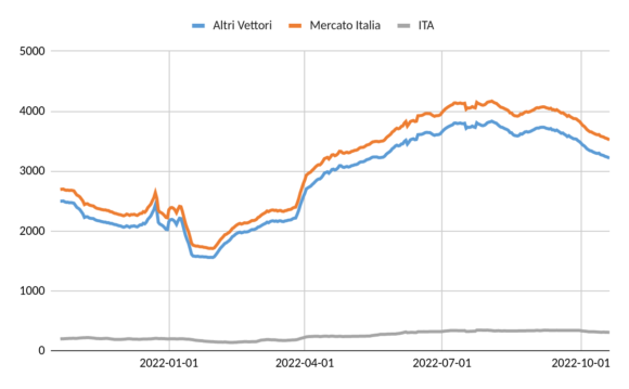 Da quando è decollata e sino a pochi giorni fa ITA ha effettuato l’8% di tutti i voli commerciali sui cieli italiani e attualmente detiene una quota di circa l’8,5%, molto simile a quella dell’ultimo trimestre dello scorso anno.