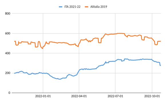 Come si può vedere dal grafico, la vecchia Alitalia in amministrazione straordinaria effettuava nell’anno 2019, prima che si manifestasse il Covid, una media di 500 voli giornalieri tanto nel trimestre invernale che in quello autunnale, per poi accrescere l’offerta in primavera, attestandosi su una media di 600 voli giornalieri nei mesi di punta di giugno e luglio, e ridurla nuovamente da settembre in avanti. La nuova ITA, invece, è partita a metà ottobre 2021 con un’offerta media giornaliera di soli 200 voli, il 40% della vecchia Alitalia, e lì è rimasta sino alla metà dello scorso gennaio. Il dato si è poi ulteriormente ridotto a meno di 150 nel mezzo dell’inverno e si è risollevato solo in primavera, per poi attestarsi su un livello di circa 330 lungo tutto il trimestre estivo, il 55% di Alitalia nella stessa stagione prima del Covid.