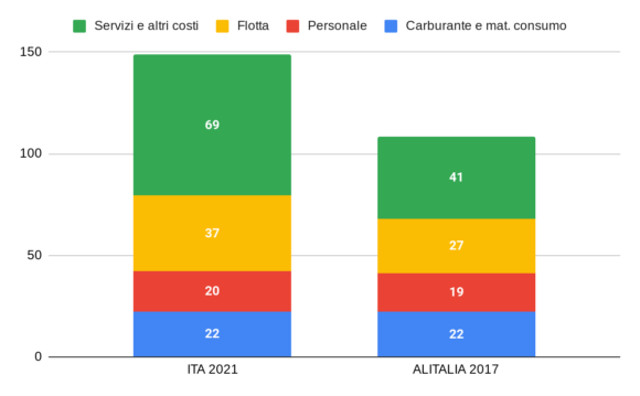 Fonte: elaborazioni su dati Relazione finanziaria ITA 2021 e audizione dei Commissari di Alitalia al Senato del 18 maggio 2018.