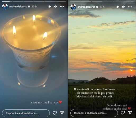 “Ciao nonno Franco”, ha scritto Andrea Dal Corso nella giornata del 1 giugno, accanto alla foto di una candela bianca accesa. In una story successiva, Andrea ha poi scritto: “Il sorriso di un nonno è un tesoro da custodire tra le più grandi ricchezze dei nostri ricordi… secondo me stai ridendo anche ora!” Ai messaggi di dolore di Andrea si sono poi aggiunti quelli della sua futura moglie Teresa.