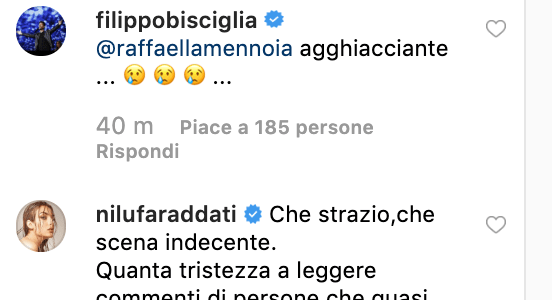 Il messaggio di Raffaella Mennoia è chiaro. L’autrice chiede ai suoi fan di condividere questo video per far sentire bene la loro denuncia contro chi usa la violenza contro gli animali specie se arriva da una persona che la vita dovrebbe proteggerla e non distruggerla. I commenti dei fan non sono mancati ma nemmeno quelli di alcuni personaggi dell’universo di Maria De Filippi a cominciare da Filippo Bisciglia che con tanto di emoticon in lacrime scrive: “Agghiacciante” e finendo alla tronista di Uomini e donne Nilufar Addati: “Che strazio, che scena indecente. Quanta tristezza a leggere commenti di persone che quasi giustificano un atto esagerato e ingiustificabile come questo….Il pitbull è un cane profondamente fedele al padrone,ed anche il cane più mansueto avrebbe reagito così. Infinito rispetto per le forze dell’ordine,ma non per individui del genere.“. Sono molti coloro che si trovano d’accordo con loro ma molti altri hanno fatto notare che ci sono persone che addestrano i cani proprio per andare all’attacco delle forze dell’ordine per proteggere i loro loschi affari. Raffaella Mennoia comunque non transige e fa notare che forse sono proprio le forze dell’ordine a non avere la giusta preparazione per affrontare questi casi: “Sono d accordo con te che polizia e carabinieri lavorano in condizioni non immaginabili ma questo non li rende diversi per me..quindi se un poliziotto o chiunque altro uccide un animale per me va punito…“.