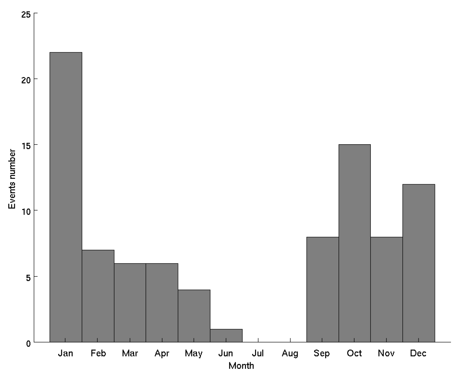 Quanto spesso accadono questi fenomeni? Non tanto spesso per fortuna, almeno per il momento. Uno studio climatologico recente ha individuato 99 medicane nel periodo dal 1948 al 2011, con una media di 1,57 eventi a stagione. Quindi, i medicane sono eventi relativamente rari, ma, se pensiamo agli effetti al suolo, più di uno di questi eventi all’anno è un numero di tutto rispetto. Lo stesso studio ha permesso di identificare i mesi più colpiti dalla formazione dei medicane. Sono soprattutto i mesi autunnali e invernali, ma non sono escluse, come vediamo dall’istogramma riportato qui sotto, incursioni nei mesi primaverili.