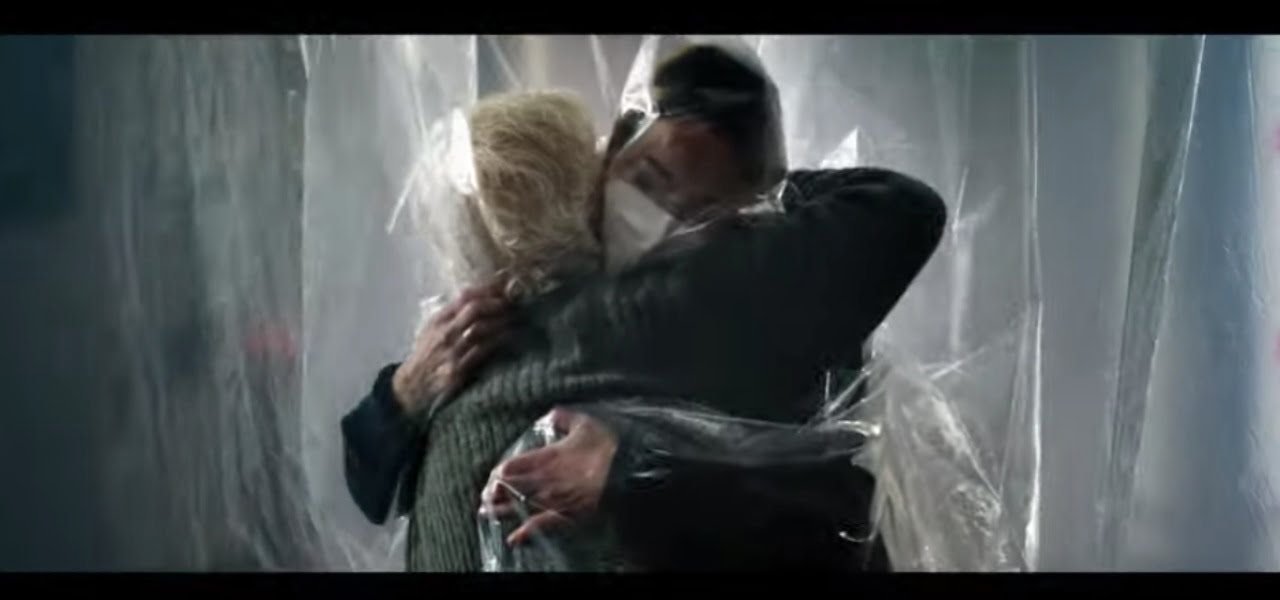 Nello spot “choc” si vede una ragazza avvicinarsi – in un’ambientazione che pare l’esterno di un ospedale – alla propria nonna, con tanto di mascherina e camice tipico di degente Covid: la ragazza abbraccia la nonna, con una particolarità, ovvero che sono entrambe avvolte in enormi teli di cellophane che cadono dall’alto. Viene data un’impressione quasi “distopica” che pare provenire da un’altra dimensione, in un futuro grigio e fosco, dove l’abbraccio è permesso solo da quel cellophane: questo perché il Covid-19, come noto, non permette il contatto fisico.