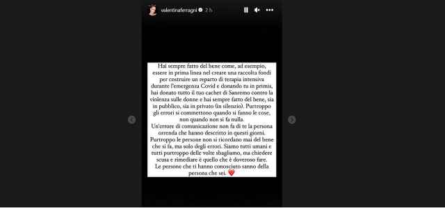“Purtroppo gli errori si commettono quando si fanno le cose, non quando non si fa nulla. Un errore di comunicazione non fa di te la persona orrenda che hanno descritto in questi giorni. Purtroppo le persone non si ricordano mai del bene che si fa, ma solo degli errori. Siamo tutti umani e tutti purtroppo delle volte sbagliamo, ma chiedere scusa e rimediare è quello che è doveroso fare. Le persone che ti hanno conosciuto sanno della persona che sei”, ha concluso.