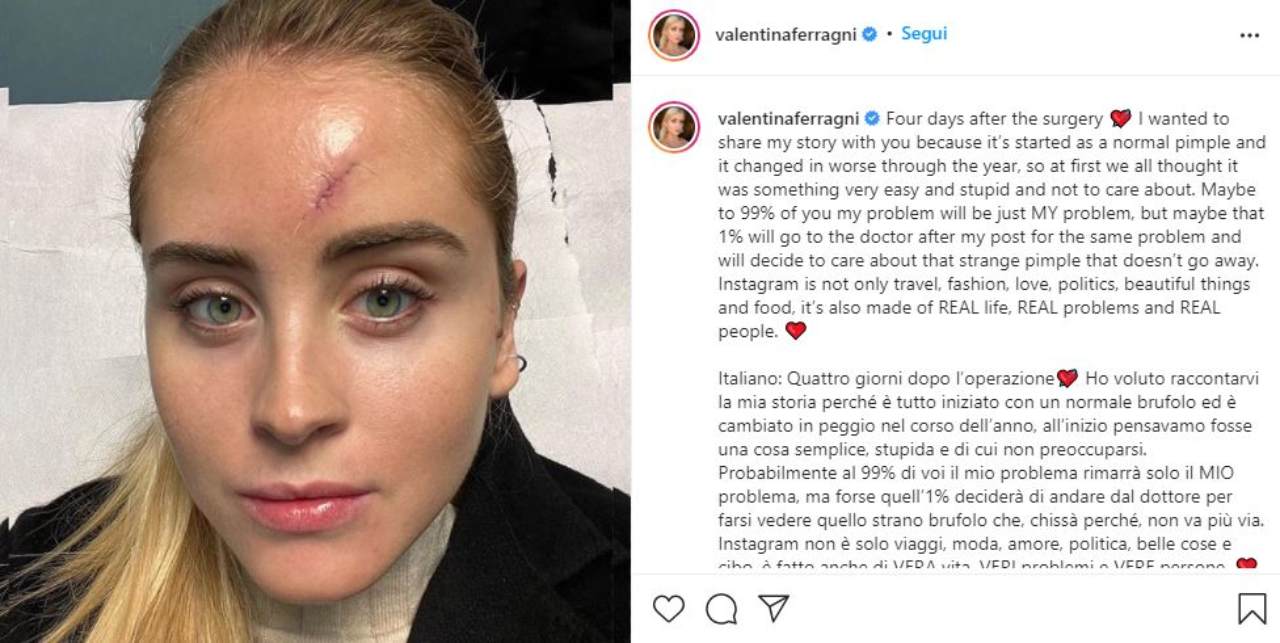 Valentina Ferragni è tornata a parlare della sua recente operazione, la rimozione di un “brufolo” che la stessa sorella di Chiara aveva sulla fronte, e che le dava ansia e preoccupazione. Come si vede dallo scatto pubblicato sulla sua seguitissima pagina Instagram (più di 4 milioni di follower), la giovane influencer ha mostrato i segni dell’intervento chirurgico, una piccola cicatrice sulla fronte, ma è logico che a quattro giorni dall’operazione, il tutto è ancora molto “fresco” e visibile. “Quattro giorni dopo l’operazione – la didascalia di Valentina Ferragni che accompagna la foto – ho voluto raccontarvi la mia storia perché è tutto iniziato con un normale brufolo ed è cambiato in peggio nel corso dell’anno, all’inizio pensavamo fosse una cosa semplice, stupida e di cui non preoccuparsi”.