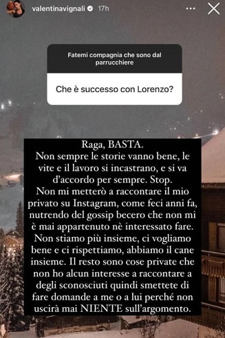 A chi ha poi chiesto a Valentina Vignali le motivazioni della fine della storia d’amore con Lorenzo Orlandi, è stato risposto con parole decise e anche severe. “Raga Basta! Non sempre le storie vanno bene, le vite e il lavoro si incastrano, e si va d’accordo per sempre. Stop.” E ha poi chiarito: “Non mi metterò a raccontare il mio privato su Instagram, come feci anni fa, nutrendo del gossip becero che non mi è mai appartenuto né interessato fare.”
