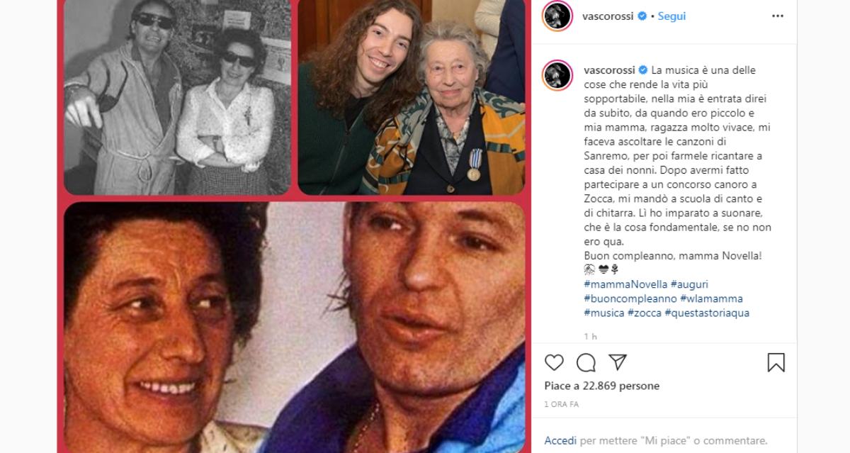 Bella dedica da parte di Vasco Rossi alla mamma. Oggi, 15 marzo, compie gli anni la signora Novella Corsi, e di conseguenza il Komandante ha voluto dedicare un post alla sua cara. Attraverso la propria pagina Instagram, il rocker ha pubblicato un collage con alcuni scatti assieme alla madre, con annessa la didascalia: “La musica è una delle cose che rende la vita più sopportabile, nella mia è entrata direi da subito, da quando ero piccolo e mia mamma, ragazza molto vivace, mi faceva ascoltare le canzoni di Sanremo, per poi farmele ricantare a casa dei nonni. Dopo avermi fatto partecipare a un concorso canoro a Zocca, mi mandò a scuola di canto e di chitarra. Lì ho imparato a suonare, che è la cosa fondamentale, se no non ero qua. Buon compleanno, mamma Novella!”. Novella, classe 1930, compie oggi 90 anni, un traguardo a dir poco prestigioso, che il figlio ha voluto giustamente onorare.