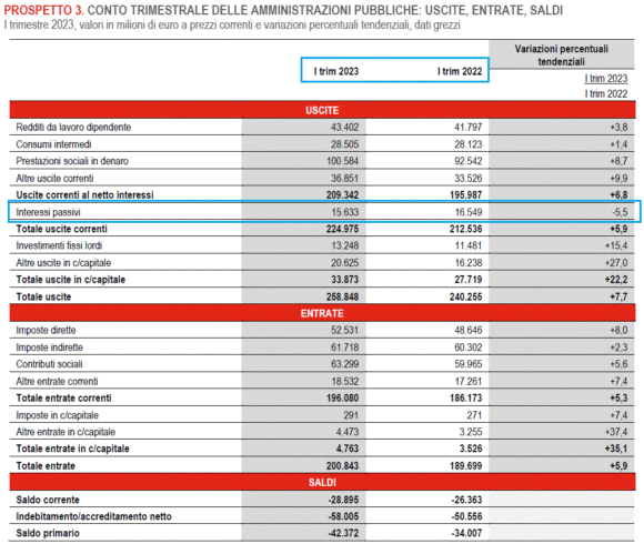 Nel suo complesso, la dinamica finora conseguita, vedrà una progressione (crescente) che troverà l’ennesima conferma il prossimo 4 ottobre mediante la pubblicazione “Conto trimestrale delle AP reddito e risparmio delle famiglie e profitti delle società” a firma Istat. È bene ricordare come nel primo trimestre dell’anno l’importo “Interessi passivi” registrava un ammontare a 15.633 milioni ossia in lieve calo rispetto ai 16.549 milioni dello stesso periodo del 2022. Solo soffermandoci a questa scomoda, ma, rilevante voce di bilancio possiamo immaginare i pensieri del ministro Giorgetti. Poco invidiabile, decisamente.