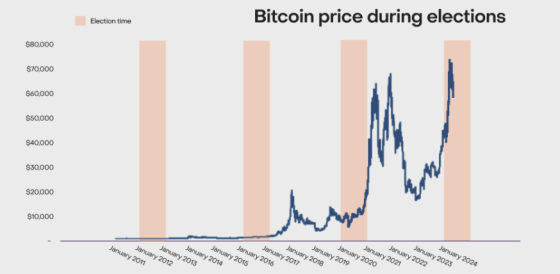 Oltre a questi due importanti avvenimenti, c’è stata la grande scalata del prezzo di BTC, arrivando a quota 73 mila dollari a marzo 2024. Questi prezzi, significativamente più alti rispetto a quelli delle precedenti elezioni, hanno accentuato l’importanza e la speculazione mediatica attorno a questo asset nella corsa alle presidenziali.