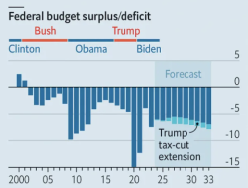Le volontà dei due partiti sono state aspramente criticate, soprattutto quella di Trump di voler prorogare i tagli fiscali. Secondo le stime del Congressional Budget Office (Cbo) mostrate nel grafico sottostante, questa manovra aggiungerebbe 350 miliardi di deficit nella spesa del Governo durante la prossima decade, equivalente all’1% del Pil statunitense.