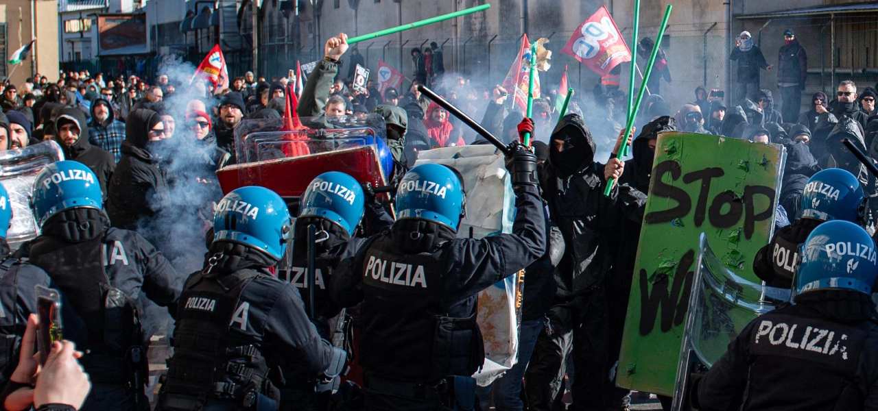 Si vedono diverse manganellate ma anche lanci di fumogeni e idranti, con la risposta di petardi lanciati dai manifestanti. Una parte dei contestatori ha deciso di deviare rispetto al percorso autorizzato dalla prefettura, ed ha quindi sfondato un cancello per raggiungere poi la fiera, e a quel punto la polizia è stata costretta ad intervenire, rispondendo con una carica. Le forze dell’ordine si sono dovute schierare a difesa dell’esposizione, con getti di acqua gelata con idranti, ma anche fumogeni, e si sarebbero registrati anche dei feriti, fortunatamente tutti di lieve entità, anche fra gli agenti.