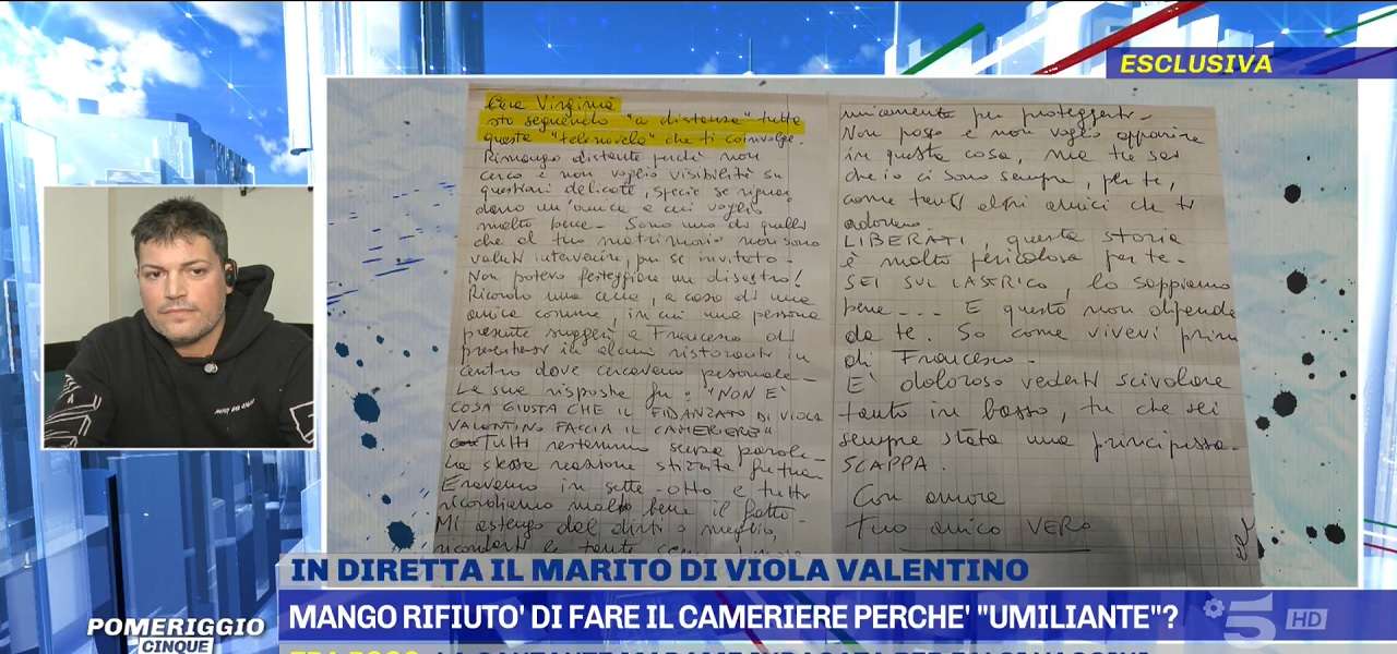 Francesco Mango e la lettera per Viola Valentino a Pomeriggio 5