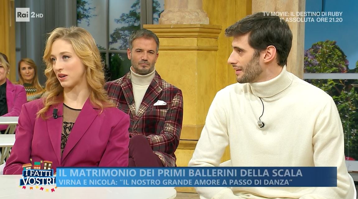 Virna Toppi e Nicola Del Freo, coniugi e primi ballerini al Teatro alla Scala di Milano, sono stati ospiti stamane del programma di Rai Due, I Fatti Vostri: “L’atmosfera magica del teatro ci ha fatto innamorare”, ha esordito Virna, mentre Nicola Del Freo ha aggiunto: “Mi ha colpito subito la sua professionalità e la sua bellezza, ero molto colpito. Ero appena arrivato a Milano, avevo mille cose da pensare… Come le ho chiesto di diventare mia moglie? Essendo timido ci ho riflettuto una vita ed ho pensato di farlo nella maniera più intima possibile. Siamo andati in uno chalet, un ristorante con solo due posti, a fine cena gliel’ho chiesto, aveva l’anello da un anno”.
