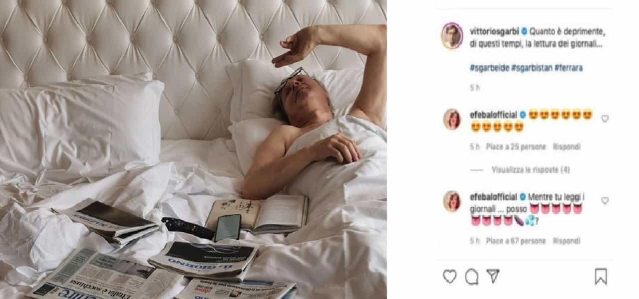 Vittorio Sgarbi sfinito a letto dopo la lettura di giornali e quotidiani: tra i tanti commenti spunta quello di Efe Bal che poi sparisce.