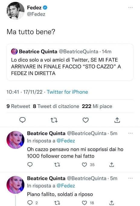 Fedez non solo ha letto l’appello della concorrente di X Factor, ma lo ha anche ripostato su Twitter, chiedendo: “Ma tutto bene?” Accortasi della gaffe, Beatrice ha replicato al giudice: “Oh Caz*o! Pensavo non mi scoprissi, dai ho 1000 follower, come hai fatto?”. Infine, rivolta ai suoi follower, ha concluso: “Piano fallito, soldati a riposo!”