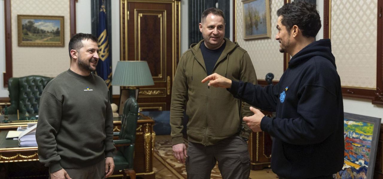 Ucraina, il Presidente Zelensky con il capo dell'Ufficio del Presidente Yermak accolgono Orlando Bloom (LaPresse, 2023)