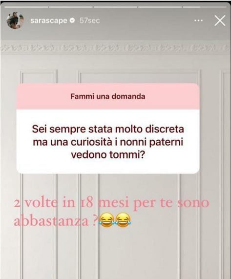 “Sei sempre stata molto discreta, ma una curiosità… i nonni paterni vedono Tommi?”, ha domandato un fan a Sara Scaperrotta. Questa la sua replica: “Due volte in 18 mesi per te sono abbastanza?”. Una risposta chiaramente sarcastica che è dunque anche un attacco ai due ex suoceri. Come però fanno notare i colleghi di Novella2000, la story in questione è stata poco dopo cancellata, probabilmente per evitare che scatenasse polemiche. Fatto sta che ai più attenti non è sfuggita. Vela la proponiamo infatti alla fine dell’articolo.