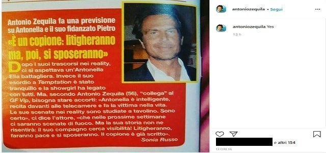 Antonio Zequila non crede ad Antonella Elia e Pietro Delle Piane. L’attore, su Instagram, ha condiviso lo screenshot dell’articolo di un giornale in cui spiega il proprio punto di vista. “Antonella è intelligente, recita davanti alle telecamere e fa la vittima nella vita. Le sue scenate nei reality sono studiate a tavolino. Sono certo”, dice l’attore. Zequila, poi, punta il dito anche contro Pietro Delle Piane: “Nelle prossime settimane ci saranno scenate di fuoco. Ma la sua storia non ne risentirà. Il suo compagno cerca visibilità. Litigheranno, faranno pace e si sposeranno. Il copione è già scritto”, conclude l’attore. Andrà davvero così tra Antonella e Pietro? Qualche dettaglio in più sul percorso della coppia Elia-Delle Piane sarà svelato nella terza puntata di Temptation Island 2020.