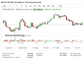 Criptovalute 20 aprile 2022, il valore di bitcoin è a 37822 euro, il prezzo ritraccia leggermente rispetto a ieri, giorno ...